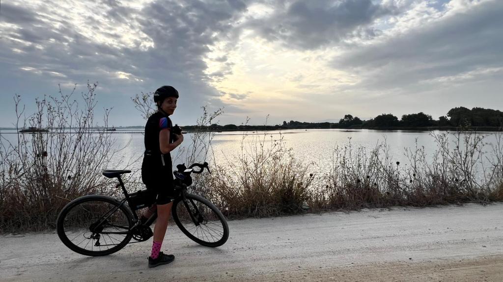 Il traffico e la tensione dei giorni precedenti nel raggiungere alcune spiagge in bici, hanno lasciato il segno, ma non voglio rinunciare a vedere la penisola del Sinis sul mio mezzo gentile. Così, punto la sveglia alle 5:30. Dopo pochi minuti scopro che in bagno non c’è acqua, perciò parto col viso ingommato e lo stomaco vuoto. Monto luci e lucine perché fuori è ancora molto buio, qui il sole sorge più tardi che a Brescia, allaccio il casco e parto. L’idea è quella di percorrere il periplo dello stagno di Cabras, una trentina di km pianeggianti. Mi butto sulla provinciale ed è buio pesto, penso, sei matta. Fortunatamente arrivo quasi subito in paese e imbocco lo sterrato che costeggia lo stagno, penso, non sei matta, per fortuna hai deciso di essere qui.