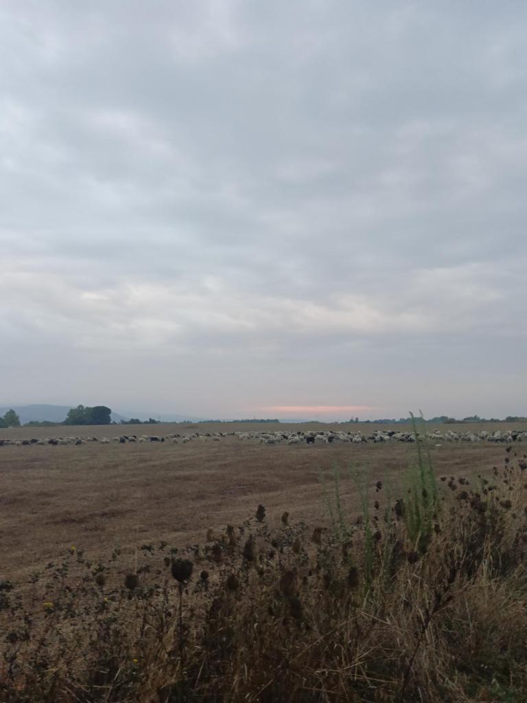 Incontro un gregge di pecore scortato da cani e pastori in bici. Io felice di vederli, loro perplessi.