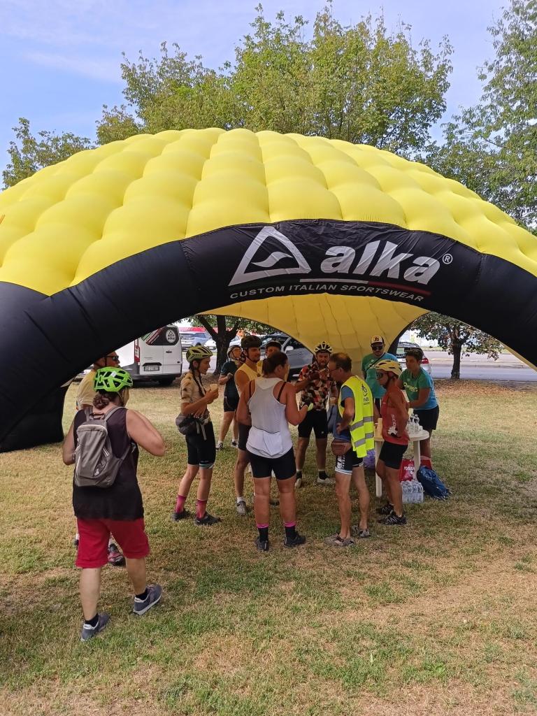 Nel frattempo ci raggiunge il super gruppo di FIAB, numeroso ed eterogeneo. La maggior parte sono persone vicine o sopra i 60 anni e le loro bici hanno quasi tutte la pedalata assistita. D’istinto penso, comoda così (!), ma poi guardandoli mi fermo a riflettere su quanto il fatto di avere una bici elettrica possa aprire porte, dare possibilità. Penso che queste persone abbiano voglia di mettersi in gioco, faticare e arrivare dove con una bici muscolare probabilmente non riuscirebbero. L’avevo sempre vista come una comodità, una via semplice, in quel momento ho visto invece tutta la sua inclusivitá.